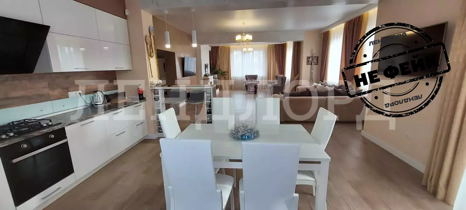 На первом этаже просторная гостиная, соединенная с кухней.