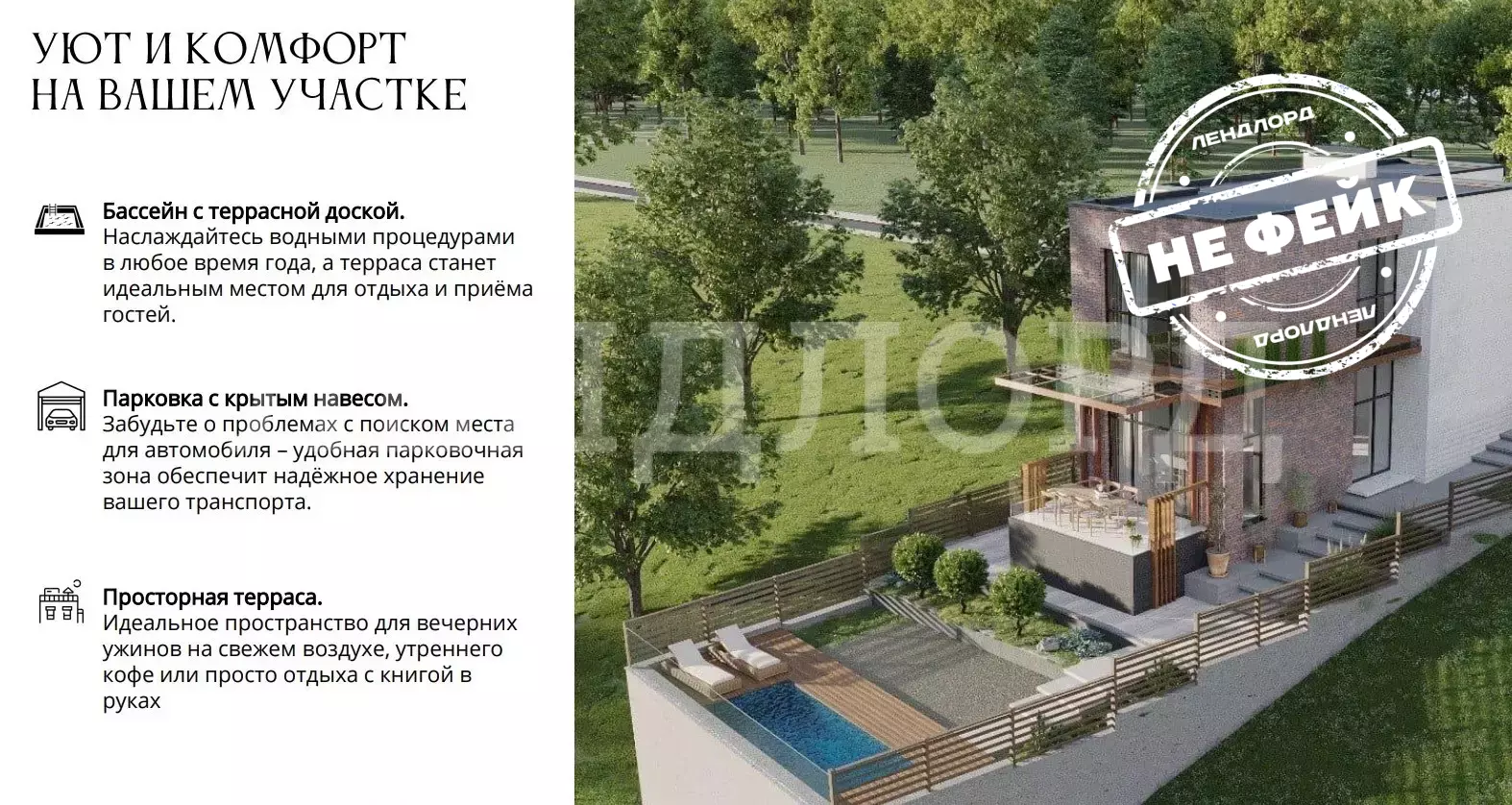 Участок огорожен, распланирован под несколько зон отдыха. Бассейн. Асфальтированный, освещенный подъезд.