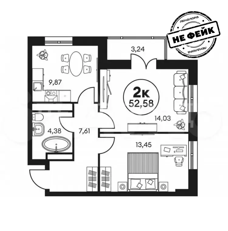 Общая площадь — 52,58 м²