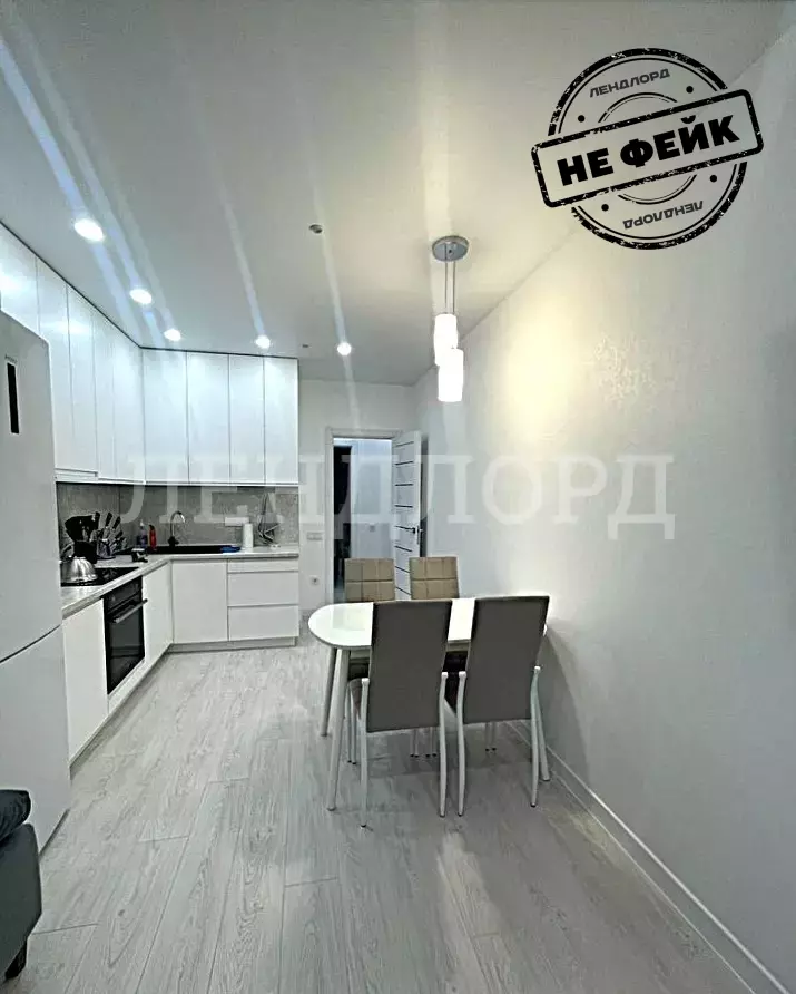 Пpoсторная кухня площадью 16 м² обoрудовaнa вcей необхoдимoй теxникой, включaя xолoдильник.